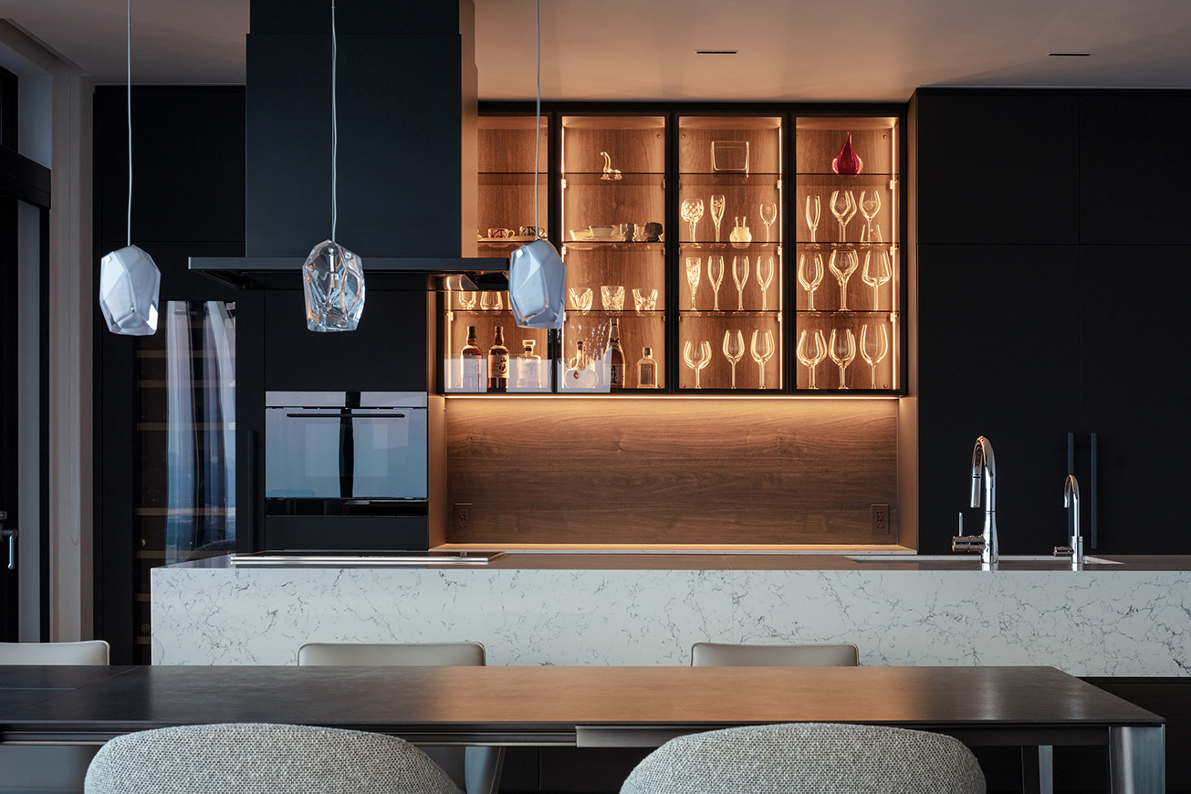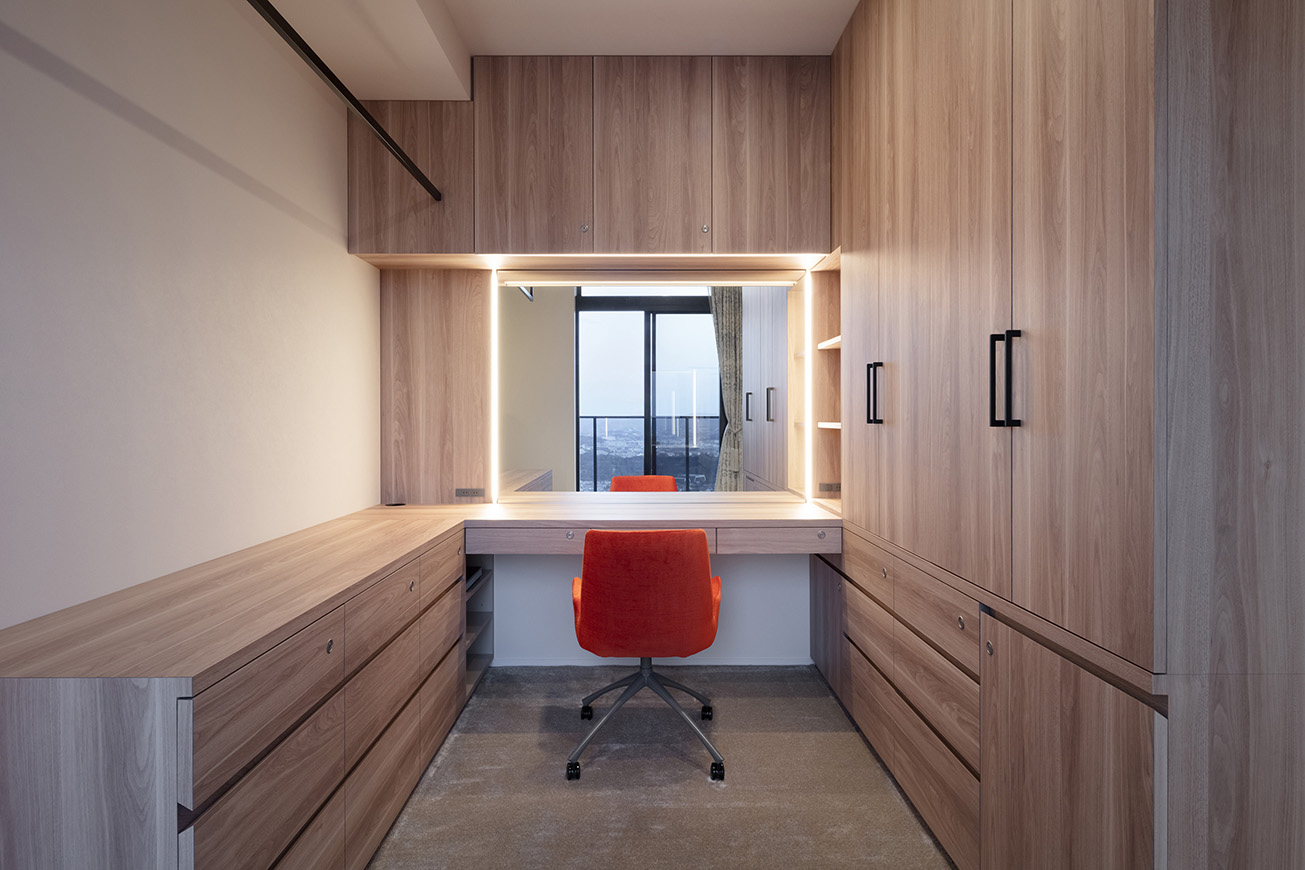 また、タワーマンションの最大の魅力である眺望を最大限活かすために、電動のハニカムスクリーンを設置しています。昼間の日射の高い時間帯には、ハニカム状になった断熱性能の高いスクリーンが室内環境を整え、夜間には天井面に納めることで遮蔽物のない抜群の夜景を演出します。